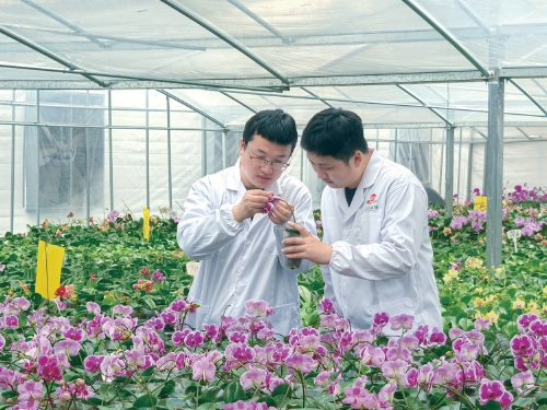 圖為農場技術人員正在查看蝴蝶蘭種苗?!∈茉L者供圖