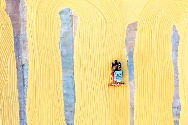 10月27日,連云港市海州區的江蘇農墾崗埠農場,職工駕駛糧食翻曬機械在場上來回穿梭,翻曬剛剛收獲的水稻。 陶桂軍 嚴連鳳 攝(視覺江蘇網供圖)