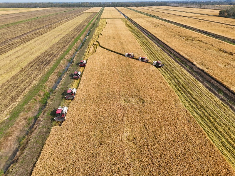 10月28日,江蘇省連云港市海州區的江蘇農墾崗埠農場,7臺收割機在農田里進行雜交水稻收割作業。連日來,崗埠農場5萬畝優質水稻陸續進入成熟收獲期,當地搶抓晴好有利天氣,積極組織農機、人員進行水稻收獲、晾曬及烘干工作,確保優質水稻顆粒歸倉。